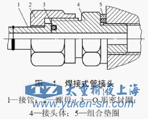 从上图可看,焊接式管接头主要由接管1、螺母2和接头4组成,用O形密封圈3密封在接管和接头体之间进行密封。当接头体拧入时,通过组合垫圈5和金属垫圈实现端面密封。管路系统的钢管和接管之间用焊式连接。优点是密封可靠、连接牢固,缺点是装配的时候需用焊接,不仅工作量大还必须采用厚壁钢管。