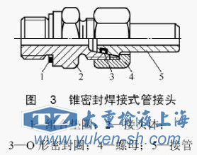 从图3可看出,锥密封焊接式管接头主要由接管5、螺母4和接头体2组成,它除了具有焊接式管接头的优点,而且密封性能更可靠,这是因为接管5上有O形密封圈,这能调节密封性能。现在锥密封焊接式管接头使用的越来越多,其工作压力为34.5MPa,工作温度为-25℃~80℃。