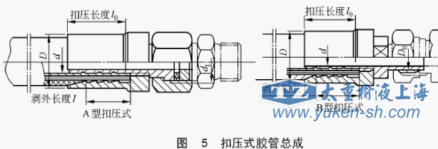 图4是扩口式管接头的结构形式,它有A、B两种结构形式。其中A型由管接头1、螺母2(起压紧作用)和管套3组成;B型由接头体1、螺母1组成。扩口式管接头的优点是加工使用方便、结构简单、性能良好,常用于以油、气为介质的中、低压管路系统,一般工作压力为3.5MPa~16Mpa之间,这取决于管材许用压力。