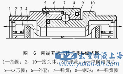 不需要使用工具就能实现管路迅速连接或断开的接头,就是快速接头。它主要有两端开闭式和两端开放式的结构形式。图6中所示的是两端开闭式。