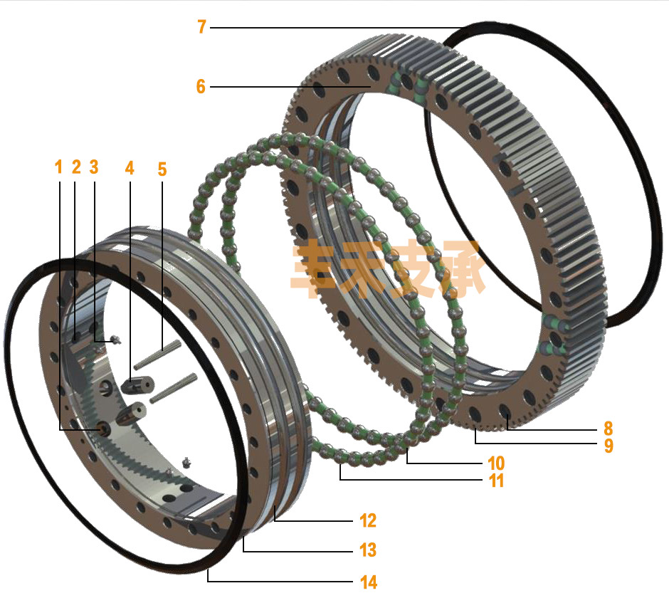 各部分回转支承结构名称如下(以双排球回转支承为例):