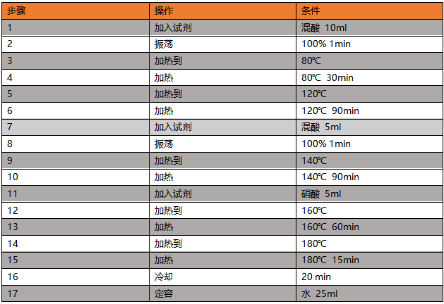 称取样品约0.5g于消解管中,放置在消解架上。分别加入混酸10ml(硝酸、高氯酸混合7:1),99%振荡强度一分钟。在80度温度下,预消解半小时。升温至120度1.5小时,补加5ml混酸,升温至140度1.5小时,补加5ml硝酸,升温至160度一小时,升温至180度15min赶酸,至白烟冒尽。方法如下: