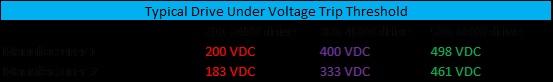 如果驱动器的稳态电压略低于标称电压,则驱动电压设置参数可以更改为该值。例如,如果输入电压为460V而不是480V,那么将驱动电压参数设置为480V将导致欠压跳闸阈值高于设置为460V的阈值。这是因为欠压跳闸设置基于编程的输入电压。