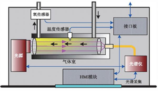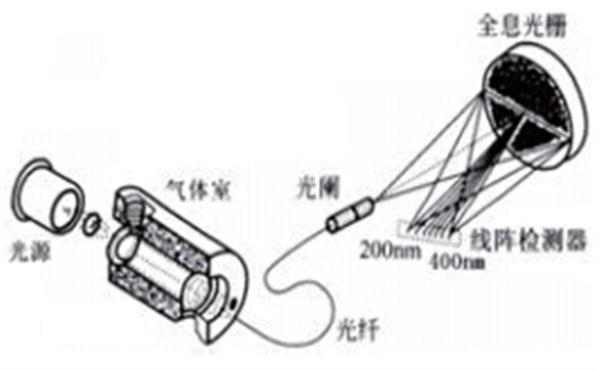 CM-5000烟气分析仪(常规量程)采用如下光学技术平台来获得紫外吸收光谱,该技术平台由光源、气体室、光纤和光谱仪(含光阑、全息光栅、线阵检测器) 等光学组件构成, 如图: