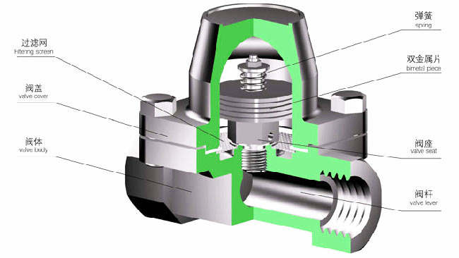 汽液两相流疏水器经特设的前端阀芯受阻后,进入阀腔内部,容器内液位缓缓上升到相变管接口处,相变管由汽相信号转变为液相信号。此时,前端疏水与液相管疏水混合,向特设的后端喉部流动。(后端阀芯为控制扩压端)由于喉口面积设定不变,当液位上升到所需正常水位时,疏水排量;当液位降低时,用汽量信号增加,进入调节器内部,使喉部疏水的有效通流面积减小,疏水排出量减少,从而达到控制水位目的。调节器内汽量的多少决定疏水排量的大小,而调节汽量由加热器内液位的高低决定,通过相变管(信号管)采集,达到调节水位目的。