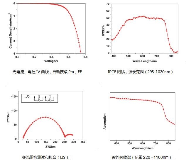 Zahner公司的CIMPS-QE/IPCE光电系统可以方便的用以钙钛矿太阳能电池(Perovskite solar cell)的测试工作。在一个平台上可以获得紫外吸收光谱(UV),填充因子(FF),zui大输出功率(Pm),光电转换效率(IPCE),IV曲线,交流阻抗(EIS)。