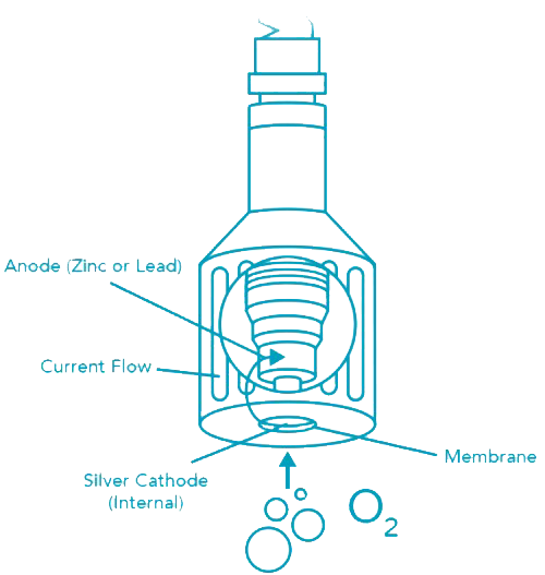 渗透膜允许来自样品水的氧气扩散到传感器中,在阴极处它被还原。 该化学反应产生电信号,该电信号从阴极行进到阳极然后进入溶解氧测量仪器。 阴极处的氧气消耗在膜上产生压力差,其基于样品中氧气的分压而变化。 因此,随着氧浓度增加,分压和扩散速率也增加,并且到仪器的电流成比例地增加。