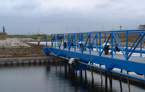 行车刮泥机是一种安装在矩形平流沉淀池上的排泥设备。刮泥机主要由工作桥、传动装置、刮泥板、污泥提升泵等组成。该机设有横跨沉淀池的固定平台,污水中的沉淀物沉淀于池底,刮泥机将沉淀的污泥刮集到中心集泥坑中,利用污泥泵将污泥排出。该机结构简单,传动平稳,运行费用低,刮泥效果好,是一种理想的排泥设备。