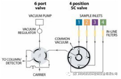 上图是一个简单的应用,右侧是一个4通道选择阀通过阀切换选择 1234种样品进入左侧的进样阀