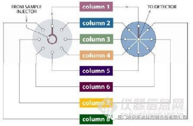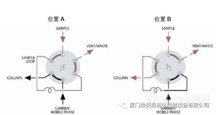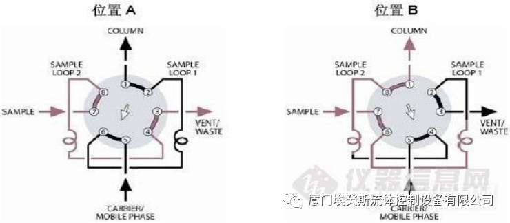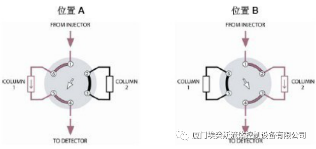 位置A,流动相走1号色谱柱 位置B,流动相走2号色谱柱