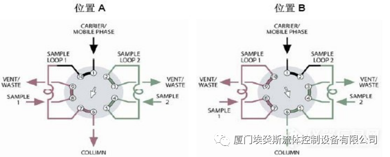 装在样品1,当阀再回到位置A,定量环1中样品注入柱子而定量环2重新装在样品2;