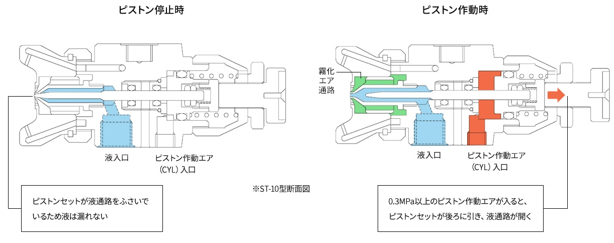 图。左边是活塞停止的时候。由于液体喷嘴的**被阀内(活塞组)堵塞,因此液体不会泄漏。右图显示了插入0.3 MPa或更大的活塞