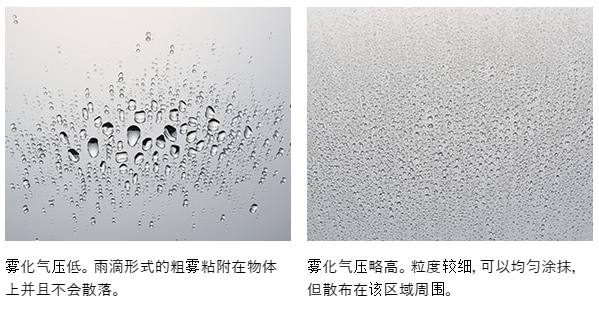 4雾的状态由液体的体积和雾化空气的压力决定。如果要产生不散落的雾气,请尽可能降低雾化气压,使粒径更粗(左图)。如果您想通过涂漆或涂布获得均勻干净的表面处理,请增加雾化气压并使粒度更细(下图)。