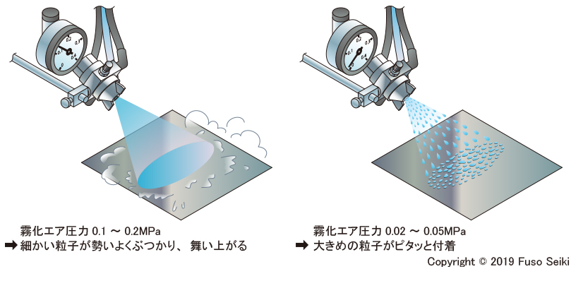 但别担心,您可以控制喷雾的状况。通过将雾化气压设置得尽可能低,可以产生具有粗粒径的软喷雾。雨滴状的油紧紧地粘附