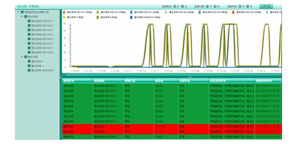 3、重点设备监测子系统:系统支持按照企业、车间、设备逐级筛选进行重点监控,支持单一设备、多个设备、按车间等多种方式监控,监控方式可灵活选择,监控人员既可通过列表方式查看设备运行及报警信息,又可通过实时曲线方式查看各设备随时间变化的实时报警值,使监控工作更形象、直观、高效。