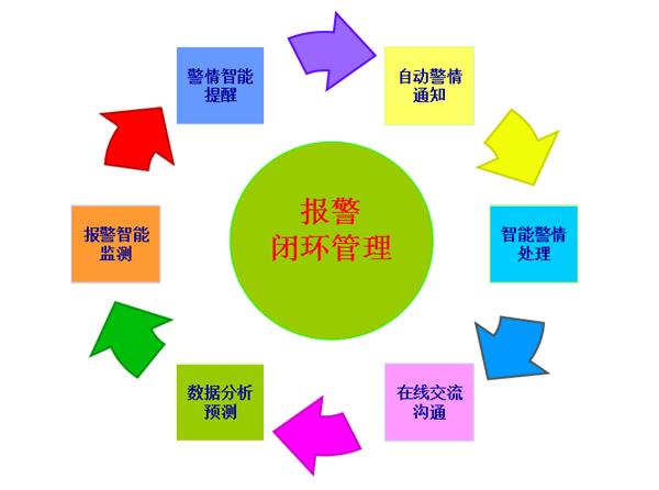 通过报警智能监测->警情智能提醒->自动警情通知->智能警情处理->在线交流沟通->数据分析预测,有效实现报警从产生、预警、通知、处理、分析、预测的闭环式管理。
