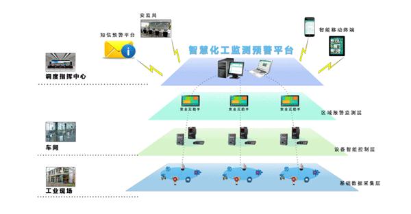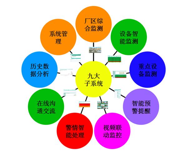 “智慧化工”监测预警平台主要包括厂区综合监测、设备智能监测、重点设备监测、智能预警提醒、视频联动监控、警情智能处理、在线沟通交流、历史数据分析、系统管理9大子系统。