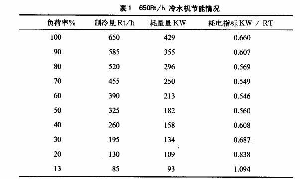 离心式冷水机缎的工作效率,除了考虑离心式压缩机本身的效率外,还与冷凝器和蒸发器的换热效率有关,所以判断离心式冷水组的效率应该判断离心式压缩机及冷凝器和燕发器的综合效率,这就为离心式冷水机组在部分负荷情况下的运行如何节能创造了条件。从各厂家离心式冷水机组运行特性曲线看,发现各种系列冷水机组特性曲线基本相同,差别很小。以美国约克公司生产制冷量650Rt/h的离心式冷水机组特性曲线为例,在部分负荷运行,节能情况列人表1。