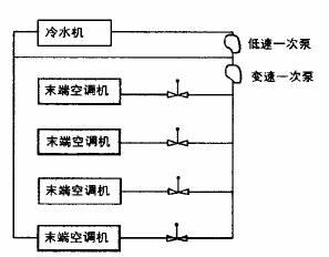 这种变水量系统包括各自带有独立泵一次和二次环路。通常一次环路中与冷水机一一对应的低扬程一次泵保持恒定的冷冻水流量,而一台或多台高扬程的变流量二次泵对二次环路冷冻水量进行调节以满足实际制冷需要,一、二次环路间流量的不平衡引起旁通管道内冷冻水流动,显然这种系统达到了保持恒定冷冻水流量通过冷水机的目的,但它不能在部分负荷时获得的冷水机效率,并且由于大多数运行工况下两个环路的流量不相等而限制了冷水机的能力,同时由于设两套泵不仅增加设备投资而且增加泵房面积。