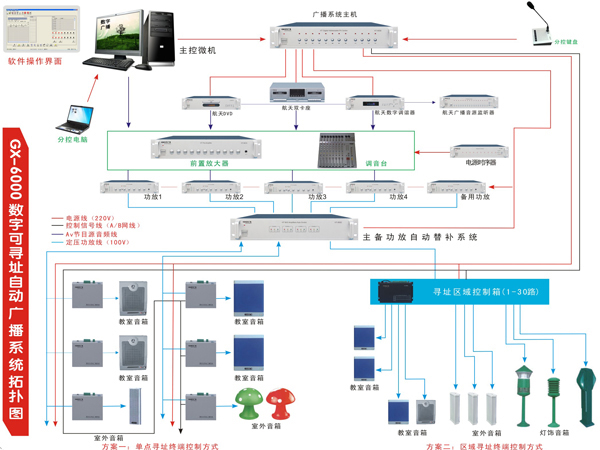 校园数字可寻址广播系统GX-8600可分五个部分:音源设备、控制设备、信号的放大处理设备、传输线路和扬声器系统。