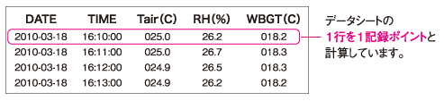 记录五项数据:DATE、时间 (TIME)、温度 (Tair)、相对湿度 (RH) 和 WBGT 指数 (WBGT)。
