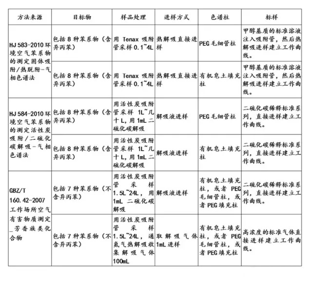 此外,在GB 50325-2010中,有关室内空气中苯和TVOC的测定也采用的与HJ583-2010类似的热脱附-气相色谱法,但所用的色谱柱不同。其中TVOC测定使用的是SE-30大口径毛细管柱,苯的测定使用的是PEG填充柱。