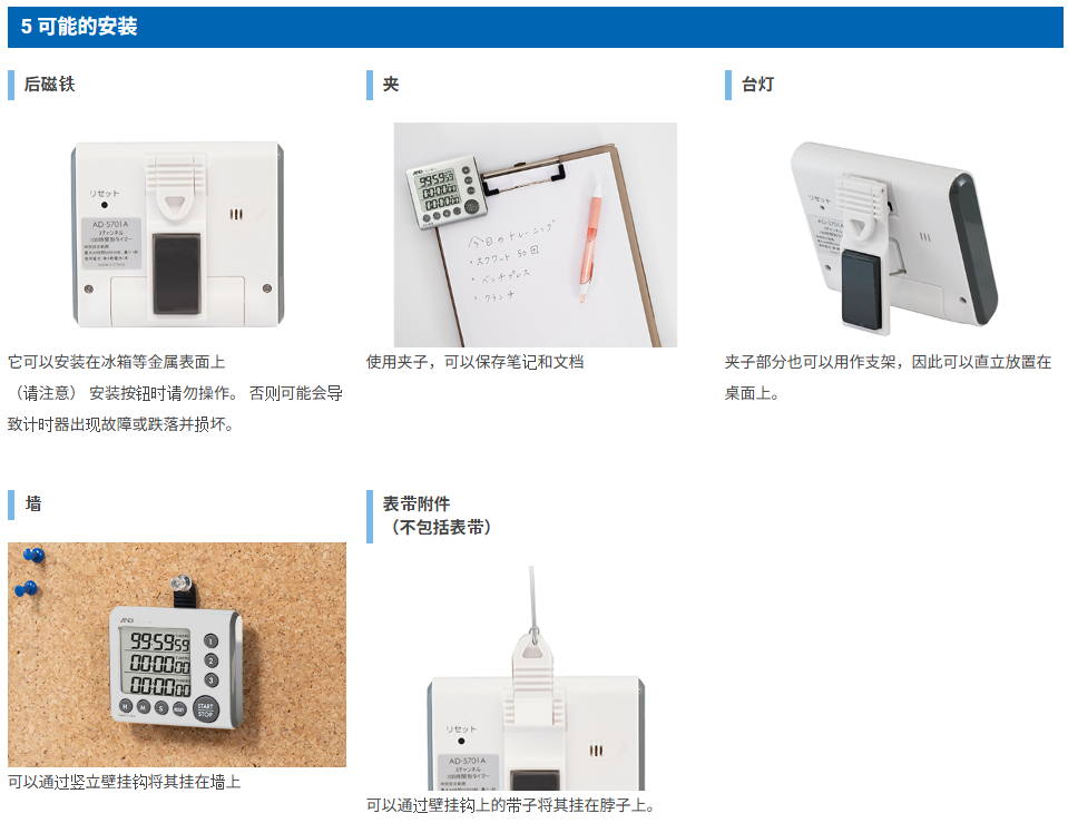 它可以通过 5 种方式使用:磁铁、夹子、台灯、壁挂支架和表带(不包括表带)