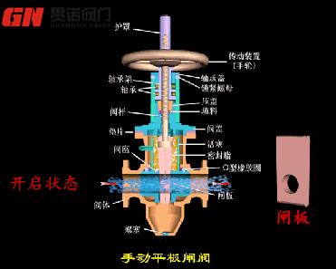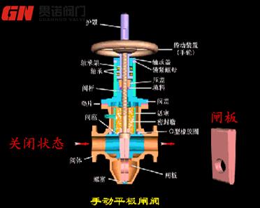 平板闸阀的工作原理是升降式的,当平板闸阀开启闸板时,逆时针旋转手轮,闸板上移,导流孔与通道孔相贯通。随着闸板的上升,贯通孔逐渐加大,限位置时,导流孔与通道孔相重合,此时全开。平板闸阀关闭阀门时,顺时针转动手轮,闸板下移至底部,由于介质压强的作用,将进口端密封座推向闸板方向,形成较大的密封比压,从而形成道密封。同时,将闸板压向出口端密封座上,成为双重密封。