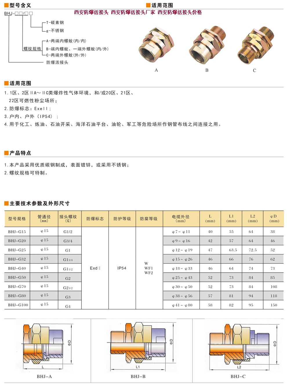1. 碳素钢制成,表面镀锌或采用不锈钢, 2. 螺纹规格可特制,如NPT螺纹,公制螺纹等。 注:标注螺纹规格时应注明内外螺纹,如CBHJ-G3/4"(内)/G1"(外)意义为一端为外螺纹G1"。 3. 符合GB3836-2000,IEC60079标准要求。 |