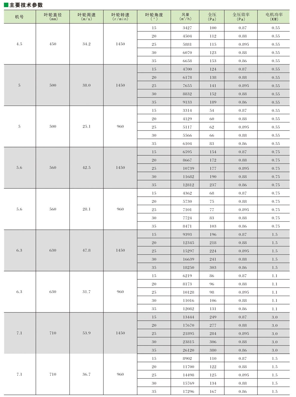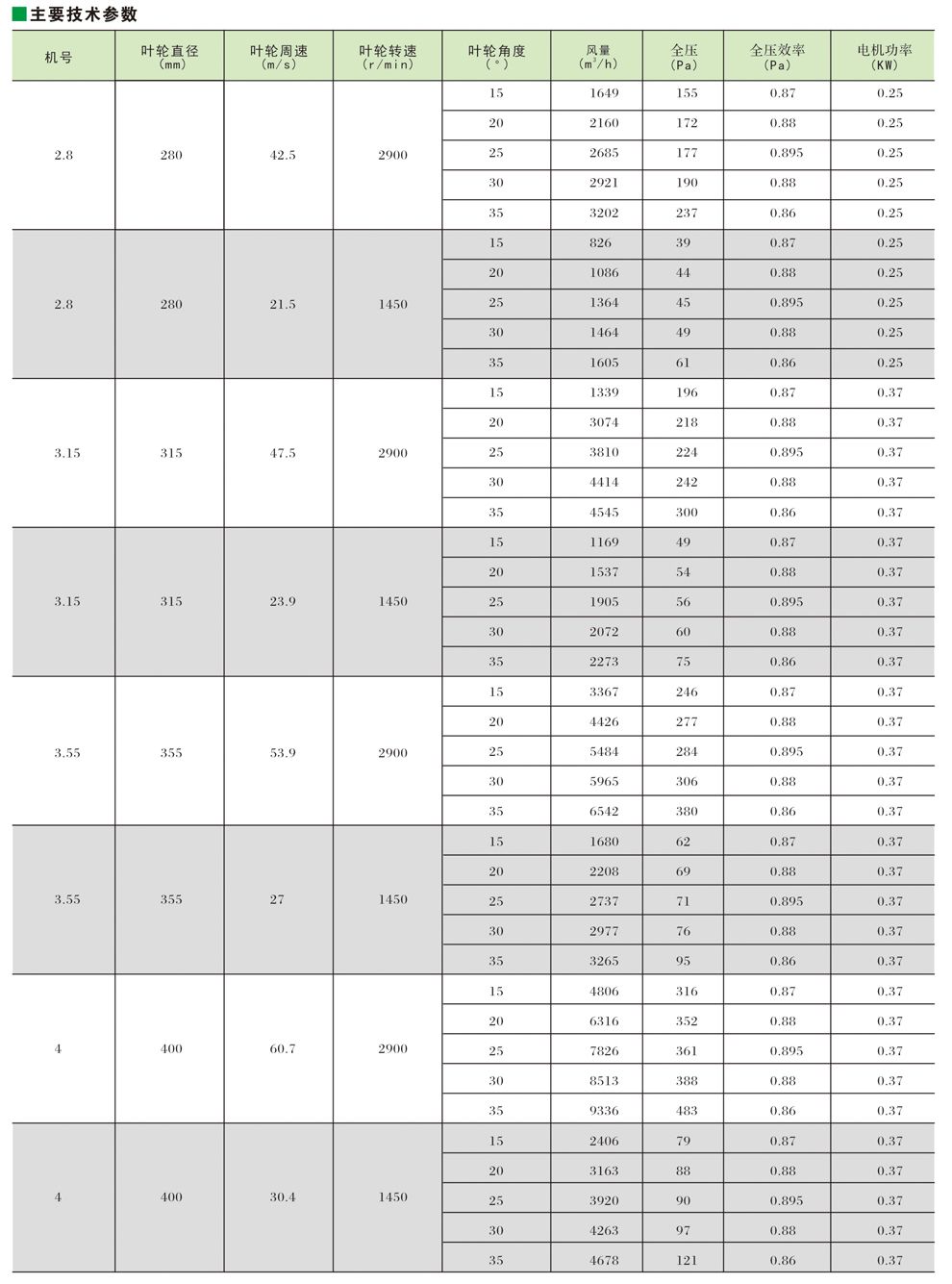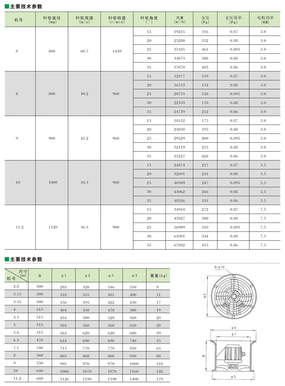 过60℃,广泛应用于一般工厂、仓库、办公室、住宅内通风换气或强暖气散热,也可有较长的排气管道内间隔串联安装,以提高管道中的压力,卸下电机可做自由风扇。防腐轴流式风机(FT35-11型),采用防腐材料外涂环氧漆加工而成,电机采用特种防腐电机用于输送有腐蚀性气体。防爆轴流式风机(BT35-11型),用于输送易燃易爆的气体。叶轮由铝合金加工而成,以防止在运转中引起火花,电机采用隔爆型电机。FT35-11型和BT35-11型风机的性能参数和外形尺寸均同T35-11型风机一样。风机需带支架脚和电机电压。请订货时注明。