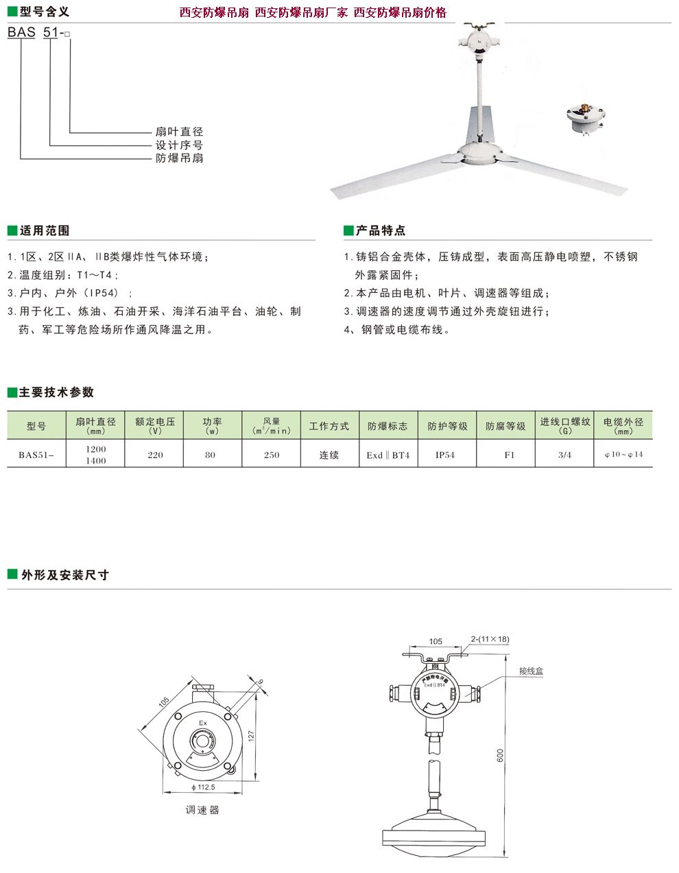 BAS51-系列防爆吊扇 适用范围 1.1 区、2区危险气体场所; 2. ⅡA、ⅡB类T1-T4组爆炸性气体或蒸气环境; 3. 户内、户外(IP54)。 技术特点 1. 铸铝合金壳体压铸成型,表面喷塑,外形美观; 2. 本产品由电机、叶片、调速器等组成; 3. 调速器的速度调节通过外壳旋钮进行; 4. 钢管或电缆布线。