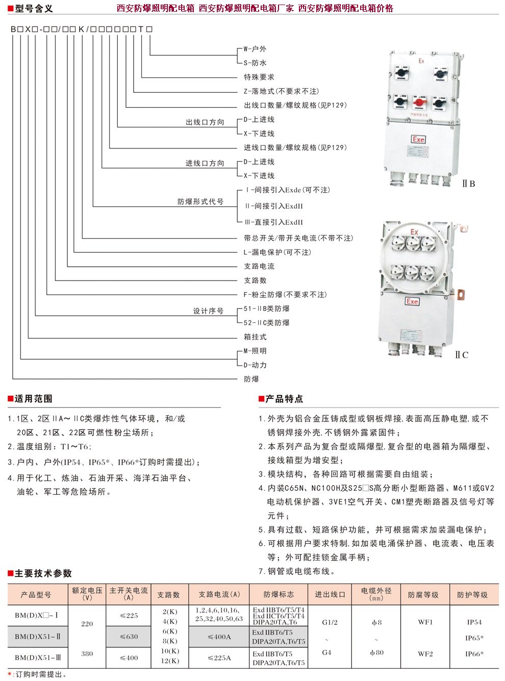 BXM(D)51系列防爆照明(动力)配电箱 适用范围: 1区、2区危险场所。 ⅡA、ⅡB、IIC类爆炸性气体环境。 BXM(D)51系列防爆照明(动力)配电箱 产品特点: 本产品复合型结构,开关箱采用隔爆型结构,母线箱及出线箱采用增安型结构。 铸铝合金外壳,内装高分析断小型断路器,具有过载短路保护功能并可根据要求增加漏电保护等功能。 采用模块结构,各种回路可以自由选择组合。有特殊要求可特制。钢管或电缆布线均可。 符合GB3836-2000,IEC60079标准要求。 西安防爆照明动力配电箱 防爆配电箱厂家报价技术特点 :1. 铝合金外壳压铸成型,表面喷塑,外形美观; 2. 内装C65N、NC100H及S25□S高分断小型断路器、M611或GV2电动机保护器、3VE1空气开关、CM1塑壳断路器及信号灯等元件; 3. 模块结构,各种回路可根据需要自由组装;4. 具有过载、短路保护功能; 模块结构,各种回路可根据需要自由组装; 5. 可根据用户要求特制,如加装电涌保护器、电流表、电压表等; 6. 钢管或电缆布线。主要技术参数额定电压380 V额定电流 20 A 防爆标志 Exde Ⅱ CT6Exde Ⅱ T5Exde Ⅱ BT6防护等级 IP54 IP55 口径规格 G1/2" G3/4" G1" G1 1/4" G1 1/4" 电缆外径(Φ,mm)8-10 10-14 12-17 15-23 18-26以上是西安防爆照明动力配电箱 防爆配电箱厂家报价的详细介绍,包括西安防爆照明动力配电箱 防爆配电箱厂家报价的价格、型号、图片、厂家等信息!BXM(D)53系列防爆照明(动力)配电箱ⅡC适用范围:1. 1区、2区危险气体场所; 2. ⅡA、ⅡB、ⅡC类T1~T6组爆炸性 气体或蒸气环境; 3. 户内、户外(IP54,IP65*)。 技术特点 :1. 铝合金外壳压铸成型,表面喷塑,外形美观; 2. 内装C65N、NC100H及S25□S高分断小型断路器、M611或GV2电动机保护器、3VE1空气开关、CM1塑壳断路器及信号灯等元件; 3. 模块结构,各种回路可根据需要自由组装;4. 具有过载、短路保护功能; 模块结构,各种回路可根据需要自由组装; 5. 可根据用户要求特制,如加装电涌保护器、电流表、电压表等; 6. 钢管或电缆布线。主要技术参数额定电压380 V额定电流 20 A 防爆标志 Exde Ⅱ CT6Exde Ⅱ T5Exde Ⅱ BT6防护等级 IP54 IP55 口径规格 G1/2" G3/4" G1" G1 1/4" G1 1/4" 电缆外径(Φ,mm)8-10 10-14 12-17 15-23 18-26以上是西安防爆照明动力配电箱 防爆配电箱厂家报价的详细介绍,包括西安防爆照明动力配电箱 防爆配电箱厂家报价的价格、型号、图片、厂家等信息!产品特点: