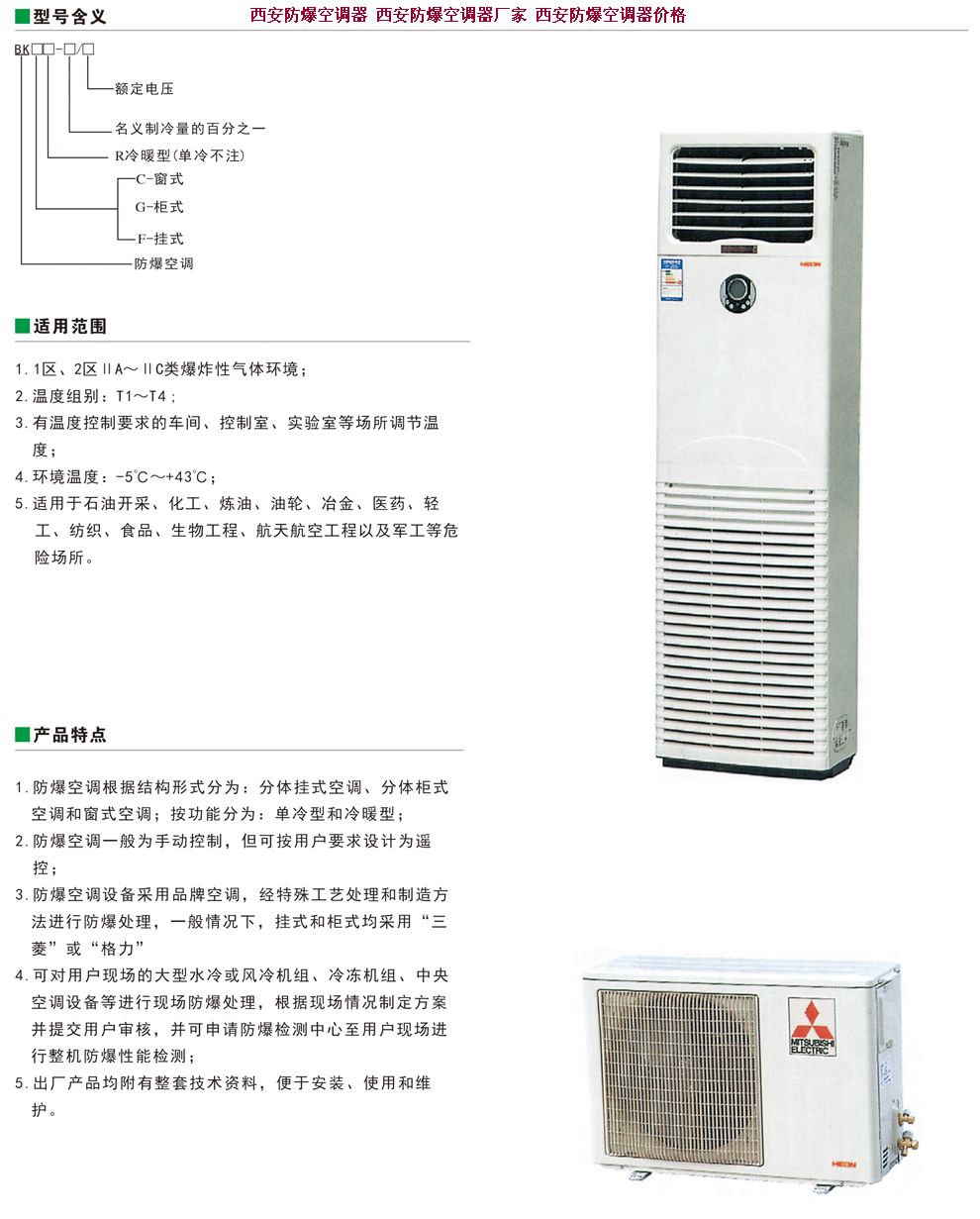 5. 防爆挂式和柜式系列产品,有可供调节、监视功能的液晶显示触摸屏; 6. 本系列产品制冷、制热功能与同规格的民用空调基本相同; 7. 产品根据结构形式分为:防爆窗式空调、防爆挂式空调、防爆柜式空调;根据制冷功能又分为:单冷型和冷暖型; 8. 温控范围广:16℃~32℃之间任意可调。