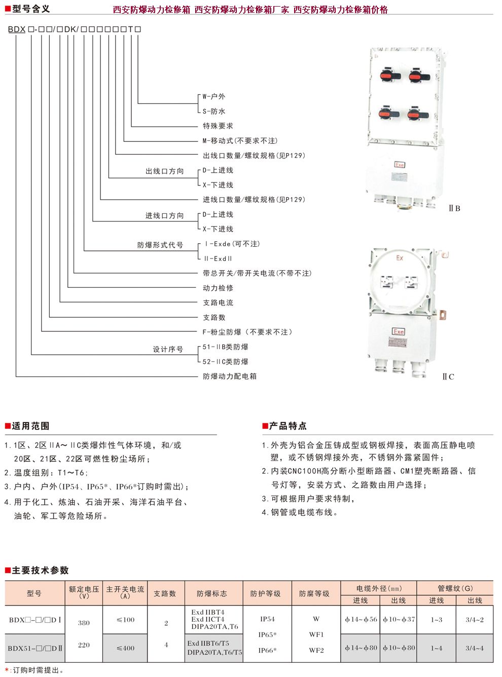 BDX口一口D系列动力检修配电箱 1.适用于1区、2区危险场所。 2.适用于ⅡA、ⅡB、IIC类爆炸性气体环境, 3.适用于爆炸性气体混合温度:T1~T6; 4.广泛用于石油开采、练油、化工、等危险环境及海洋石油平台、油轮等危险场所工作及场景照明之用。 5.注:要求IIC类或户外使用时请注明 | ||||
