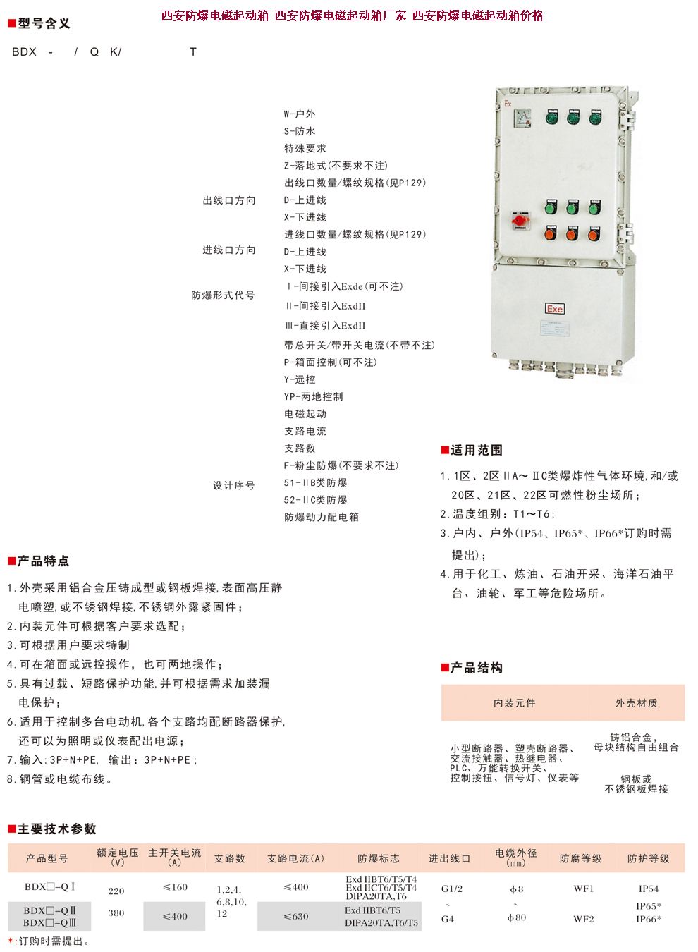 1.2 适用于IIA、IIB、IIC级爆炸性气体环境;1.3 适用于可燃性粉尘环境20区、21区、22区;1.4 适用于温度组别为T1—T6的环境;1.5 适用于石油石化、化工、酿酒、医药、油漆、纺织、印染、设施等爆炸性危险环境;注:要求ⅡC级时请注明。要求带漏电功能请注明。BDX口-口L防爆漏电保护配电箱