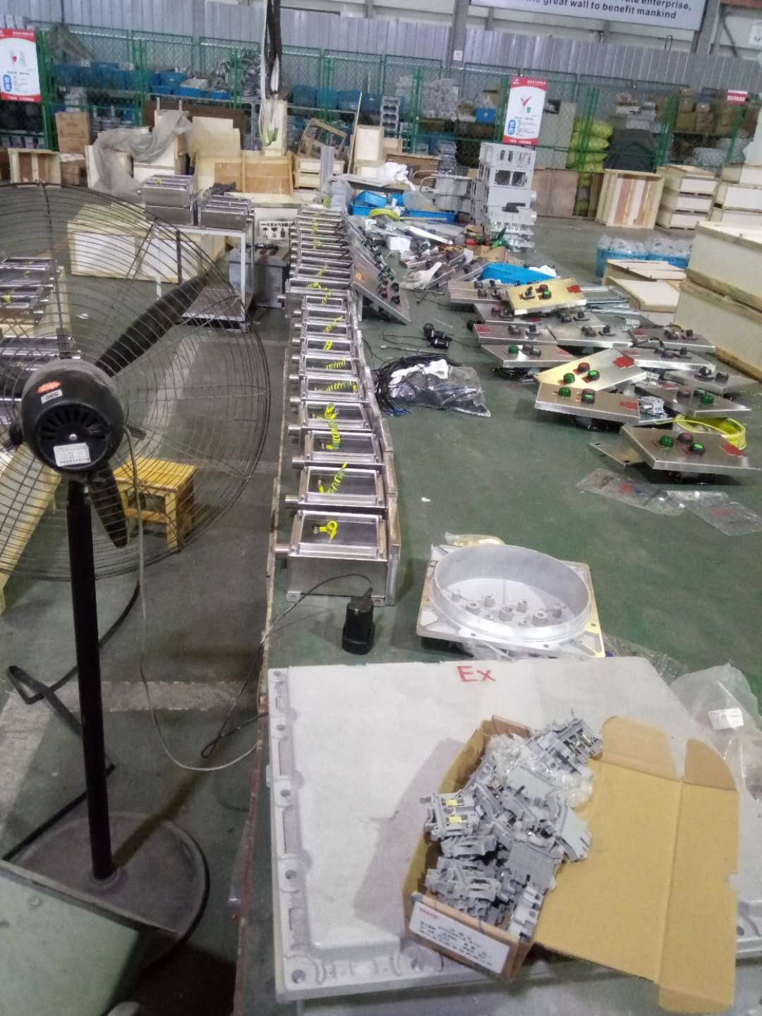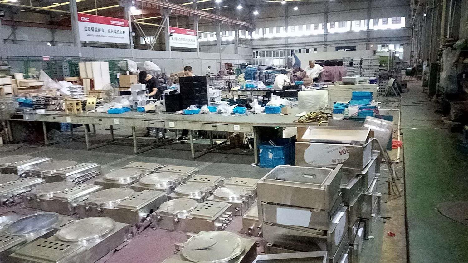 西安飞越照明科技有限公司:主要生产防爆电器类:防爆配电箱,控制箱,接线箱,防爆软起动,防爆磁力起动器,防爆操作柱,防爆柜等 防爆灯具类:防爆灯,防爆LED灯,防爆LED马路灯,防爆管件类:防爆管接头,活接头,防爆穿线盒,防爆接线盒,防爆开关等 防爆其它们类:防爆风机,防爆静电接地装置,防爆空调,防爆风扇,下图为车间一角: