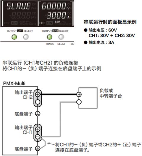 通过将本产品的CH1与CH2在本产品内部进行串联连接把2个通道进行组合,可扩大电压的输出范围进行使用。运行中CH2为Master(主机),CH1为Slave(副机)。如串联运行的情况下,则输出电压将以CH1与CH2的合计值输出。