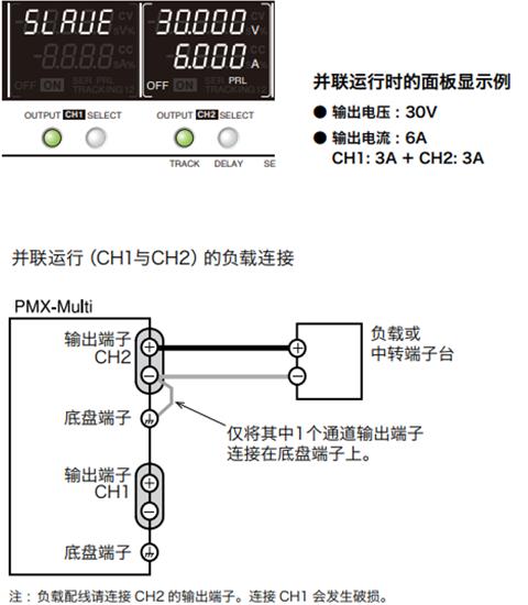 通过将本产品的CH1与CH2在本产品内部进行并联连接把2个通道进行组合,可扩大电压的输出范围进行使用。运转中CH2为Master(主机),CH1为Slave(副机)。如并联运行的情况下,则输出电流将以CH1与CH2的合计值输出。