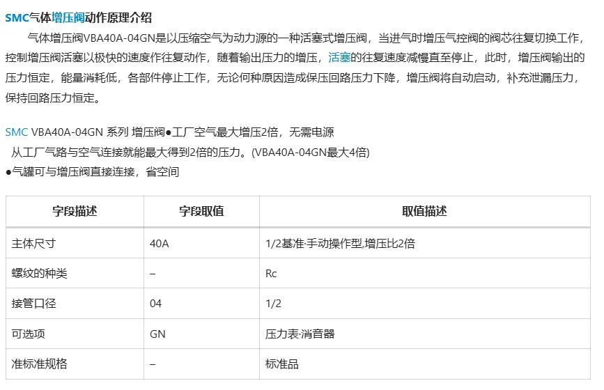 综上所述,VBA40A-04GN是一款高效、节能且操作简便的增压阀,适用于多种工业用途,能够在不需要电源的情况下