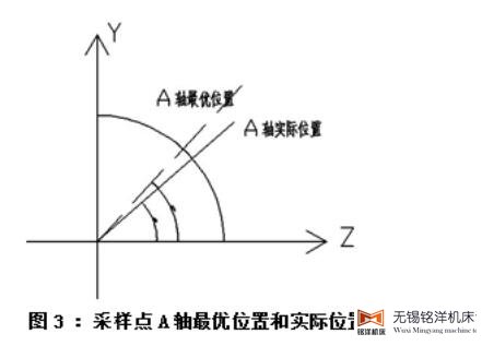 在旋转路径所在的象限中选取若干机床实际坐标采样点,通过Y、Z轴的实际位置可以计算出A轴位置图3的值,A的实际位置由采样得到,计算A轴的位置和实际位置之间的误差值,根据误差总和和采样点的个数,由计算公式:/ 得到误差平均值,就可以判断直线轴和旋转轴的强弱。C轴与X、Y轴的判断方法和A轴的方法是一样的。