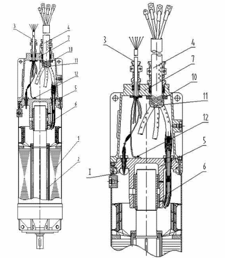 防爆潜水电泵包括定子1、转子2、动力电缆4、控制电缆3和接线盒7,转子的输出端通过上导轴承座5安装有上导轴承6。接线盒7内的动力电缆4上套设有防拔垫圈10,与防拔垫圈10相邻处的动力电缆4上装有电缆密封头11,电缆密封头11呈球状;当外力拉动电缆时,防拔垫圈10就卡住电缆密封头11,不被拉出,这样就保证了接线盒7内部导体连接不被破坏。接线盒7内的控制电缆3中的一根导线通过接地件12固定在上导轴承座5,控制电缆3中的另一根导线连接着水位探头13,水位探头13固定在上导轴承座5上,且水位探头13的探测端伸入至定子腔内; 这样,水位探头13和接地12之间就会有一个电阻,测量两者之前的电阻,就能检测到电机腔内的水位变化,当水位低于水位探头13时,也就是低于上导轴承6时,电阻信号就发现变化,而触发报警系统。