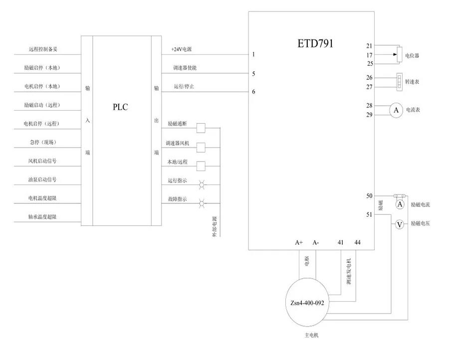 在调速器的外围增加PLC控制方式,将外部关联项与ETD791调速器的启停、运行、速度给定等通过PLC转换连接,完成互锁及关联关系。通过PLC完成与控制部分的连接,实现远程控制的功能。