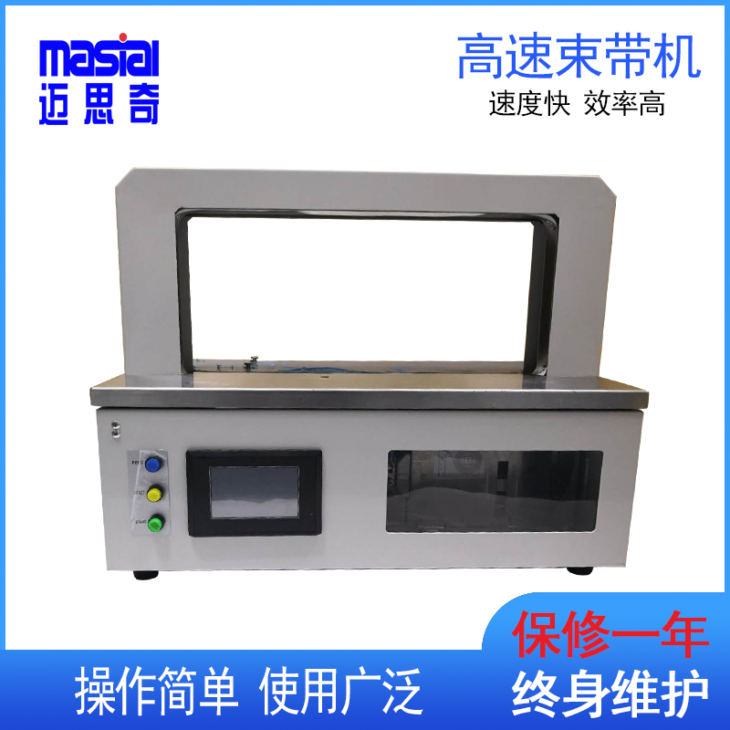 高速全自动束带机适用于制药、食品、印刷、金融、IT、日用化工等多种行业. 可以对纸盒进行联体捆扎, 也可对多片、多条、多根、多盒的较小的硬、软质制品实施成组捆扎.