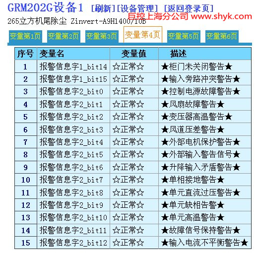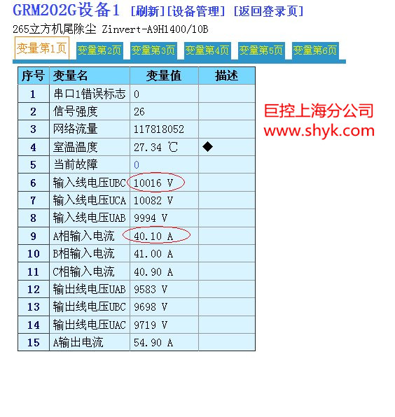 11台智光10kV高压变频器通过电脑和手机远程无线通讯监控 (GRM202G) GRM200远程监控过的变频器还包括合康亿盛,LG,台达等。 应用难点:高压变频器电磁干扰 应用对策: 具备抗干扰能力,采用磁隔离,电源隔离供电,双重看门狗技术。 硬件组成:采用11台GRM202G,通过485接口与智光的高压变频器通讯,采用标准MODBUS协议 GRM202G自带温度探头,测量高压变频器所在室内温度。 上位机电脑只需上网,无需固定IP,即可完成监控! 功能要求:1:通过手机网页浏览变频器的三相电压,电流,输入功率,功率因素,当前频率,实际频率, 故障状态 2:短信报警功能,当变频器出故障或者温度过高,短信通知,并拨号给值班人员报警,确保生产安全 3:远程电脑通过巨控组态软件直接监控11台高压变频器,并记录电压和电流,可形成趋势图和报警表格。