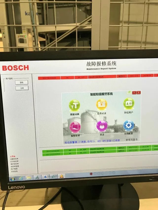 巨控GRM模块让组态软件也能发短信,博士(BOSCH)长沙工业园故障报修系统加装巨控OPC智能短信报警系统,原有系统监控系统为WINCC,巨控智能短信报警通过wincc的opcsever直接调用wincc中的数据信息,进行短信报警,wincc系统不做任何改动,所有增加的短信报警功能都在巨控OPC智能报警系统实现。巨控的GrmOpcSMS 可以实现从服务器软件上通过 OPC 接口读取相关的数据,并根据报警条件通过 GrmOpc 短信报警模块,发送到相关人员的手机上,使相关人员时间了解警报信息,使问题得到及时处理。GrmOpcSMS 是一个短信发送与管理软件,可以从OPCServer 读取数据,比如从Intouch,Wincc,Ifix,组态王,力控等, 读取数据并按照客户的要求处理,再发送到报警短信指定手机上。