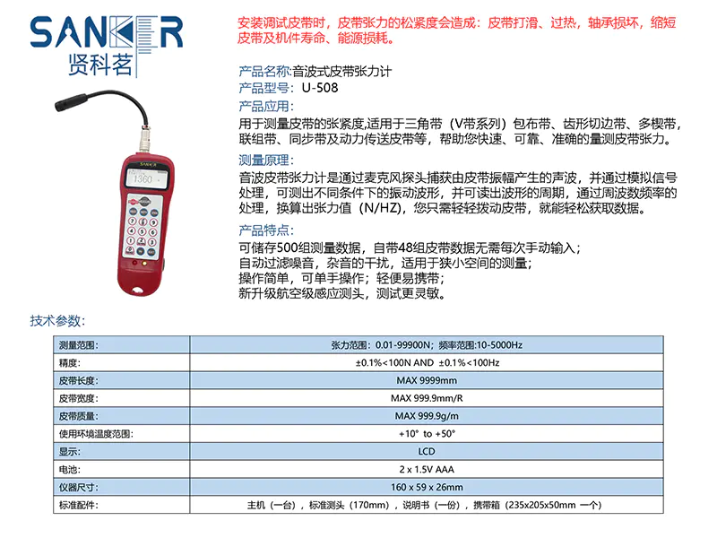 音波式皮带张力计由两部分组成,手持测量仪与相连的麦克风测头;非接触式张紧力的测量。