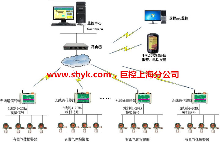 某石油公司厂区四个角(对角约3-5公里)分别增加4台可燃有毒气体报警仪(3线制模拟量信号),增加四套无线传输设备,将16台报警仪信号输出传输到控制室,报警仪是三线制4~20MA模拟量输出,上层单台计算机,软件和无线传输厂家成套。