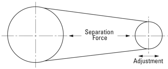 当皮带系统使用简单的双皮带轮配置时,皮带轮轴之间的距离与皮带上的张力直接相关,因此可以使用该距离来确定皮带张力。这种方法通常称为轴分离法。但请注意,如果皮带轮具有不同的直径,则需要将皮带跨度添加为矢量以确定*终的张力。