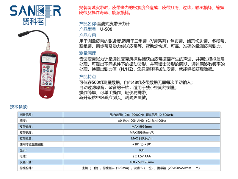 声波张力测量设备使用简单,但环境噪音会影响其准确性。为了解决这个问题,贤科茗皮带张力计U-508包含增益调节器或软件,使设备能够“消除”环境噪声并提供**度为 ±1% 的张力测量值。