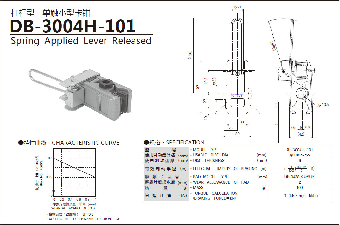 KEST盘式制动器利用轴向压力使圆盘或圆锥形摩擦面压紧,实现制动。全盘式或点盘式对称布置时,制动轴不受弯曲力。结构紧凑,瓦块磨损均匀,制动力矩大小与旋转方向无关。用于防尘防潮时,可制成密封型。点盘式散热性好,全盘式散热性较差。特别适用于紧凑性要求高的场合,如车辆的车轮电动葫芦等……。